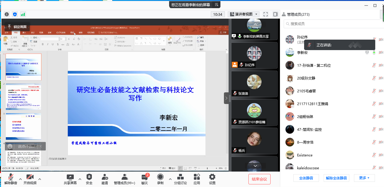 师生作了题为“三级片必备技能之文献检索与科技论文写作”的主题讲座。他阐述了本硕博不同学习阶段学习任务、学习目的、学习方法、;提出了研究创新的重要性;并结合自己的三级片